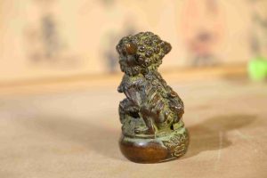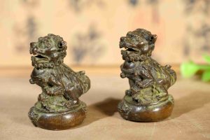 / A pair of suspected copper base lion-shaped ornaments in the form of drums, from the old collection.