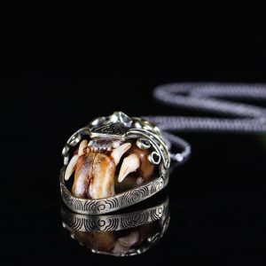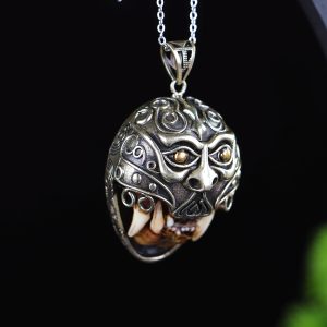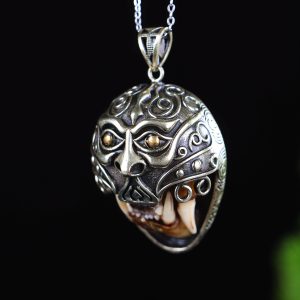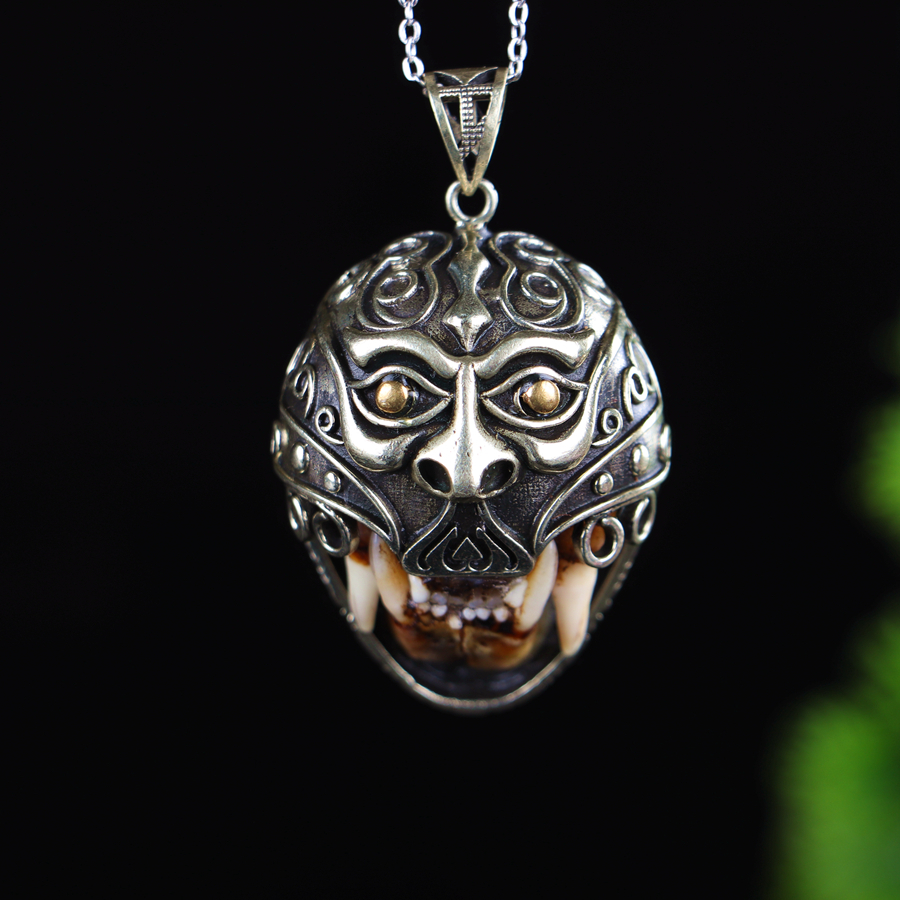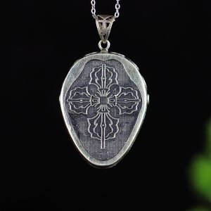 Old collection: Large black-tinted copper Manjusri Vaisravana pendant with gold inlay.