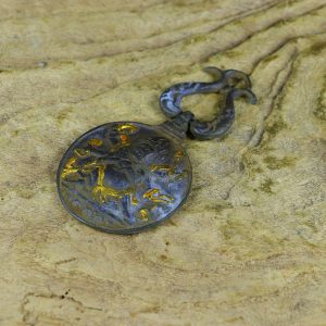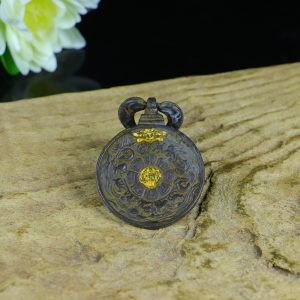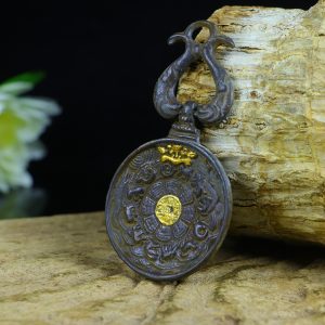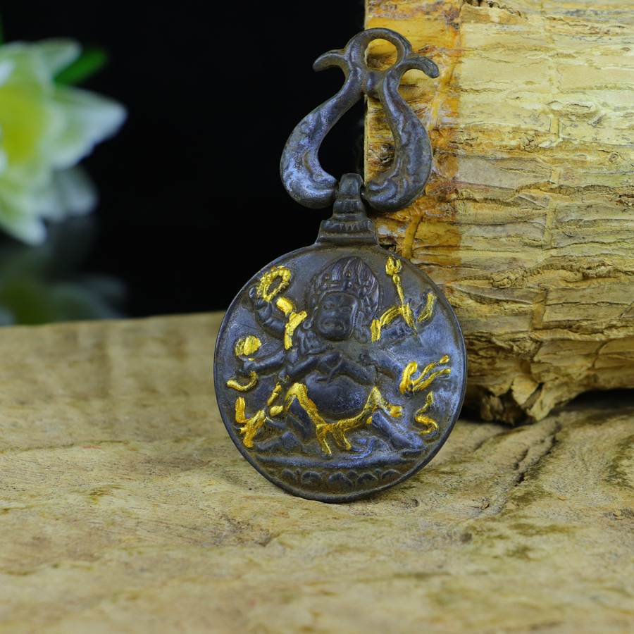 / Old collection: Large black-tinted copper Manjusri Vaisravana pendant with gold inlay.