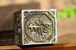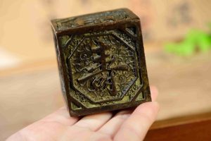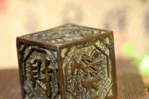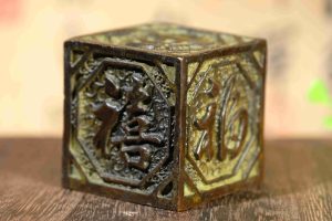 Old collection, suspected copper base seal-shaped figurine of happiness, prosperity, longevity, fortune and wealth