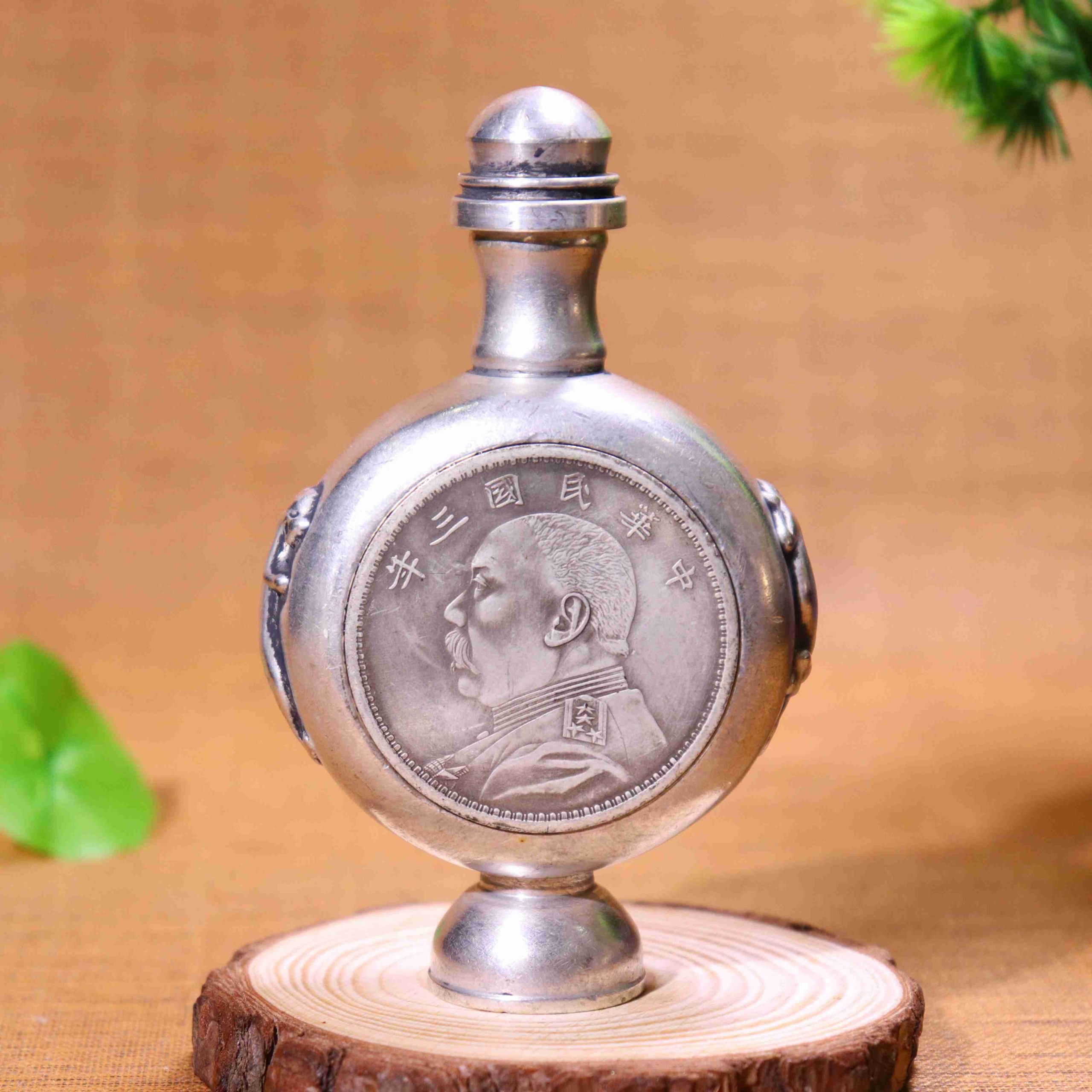 Old collection treasure: A copper gilded with silver and inlaid with silver dollar dragon pattern snuff bottle 数量